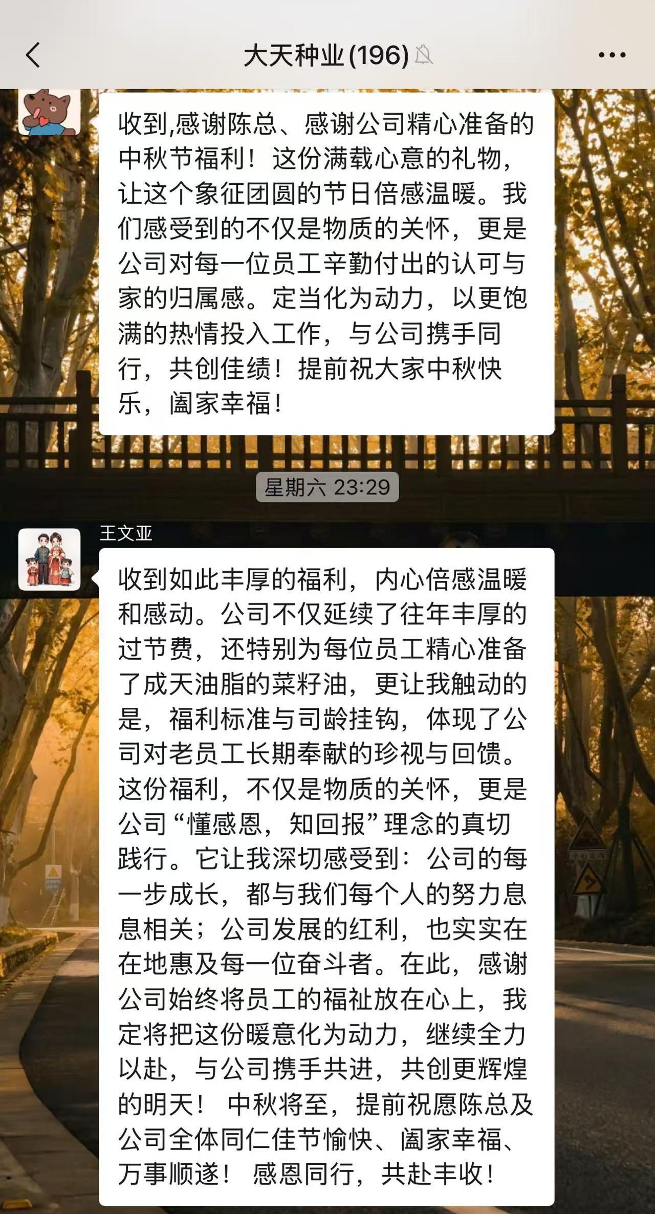 2025年中秋佳節(jié)將至,云南大天種業(yè)有限公司以實(shí)際行動(dòng)踐行“懂感恩,知回報(bào)”的企業(yè)理念,為全體員工送上了一份豐厚的節(jié)日關(guān)懷。在延續(xù)往年過節(jié)費(fèi)的基礎(chǔ)上,公司特別增發(fā)“成天油脂物理壓榨二級(jí)菜籽油”作為中秋福利,讓每一位員工在團(tuán)圓佳節(jié)感受到來自企業(yè)的溫暖與認(rèn)可。