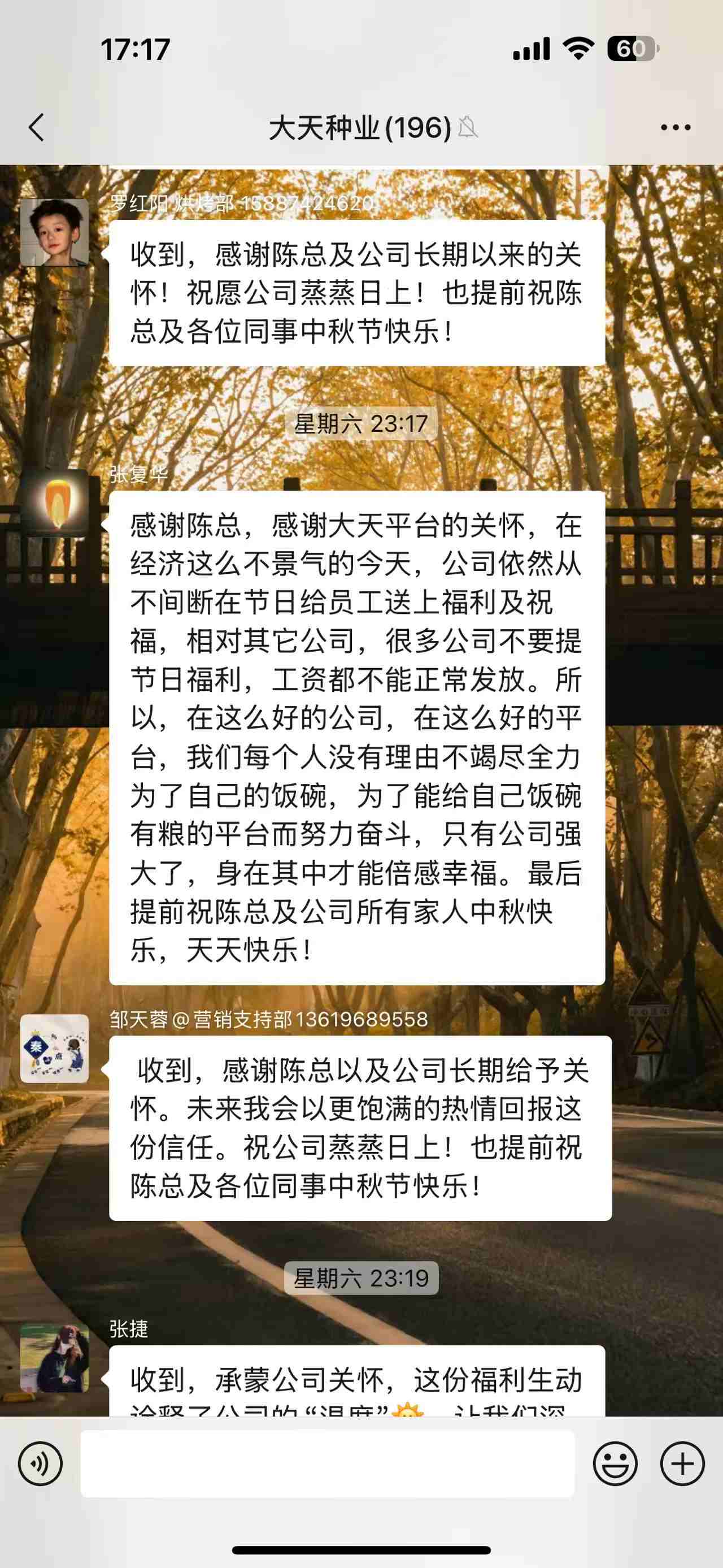 金秋送爽,丹桂飄香。云南大天種業(yè)以實(shí)實(shí)在在的福利傳遞企業(yè)對(duì)員工的深切關(guān)懷,進(jìn)一步增強(qiáng)了團(tuán)隊(duì)凝聚力和員工歸屬感。未來,公司將繼續(xù)秉持“以人為本”的管理理念,與全體員工攜手共進(jìn),共創(chuàng)更加美好的明天。